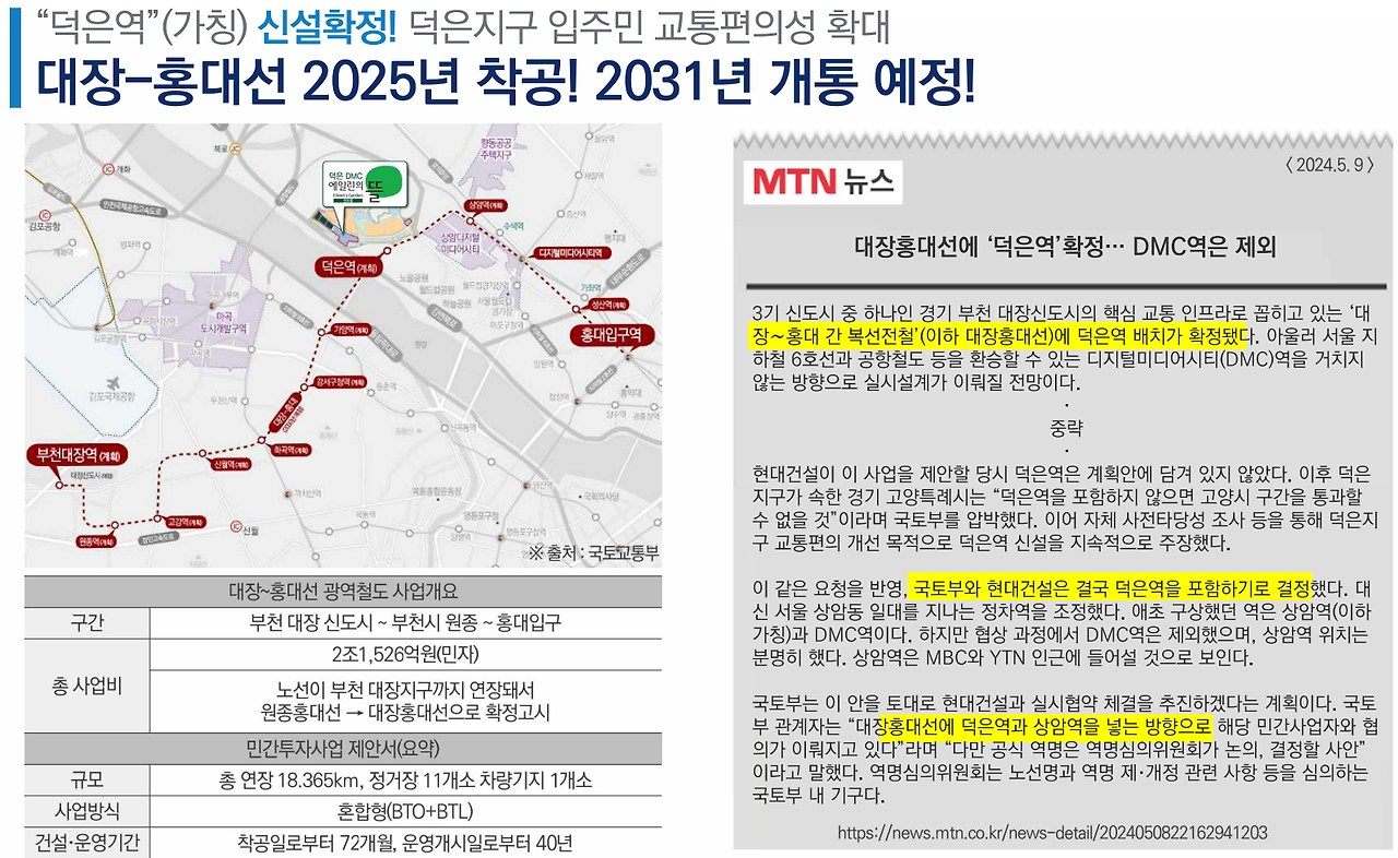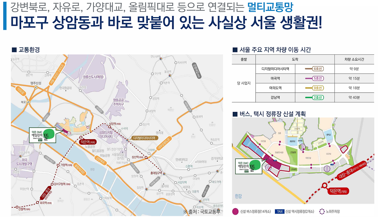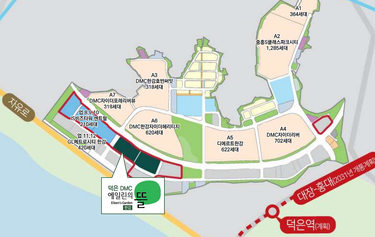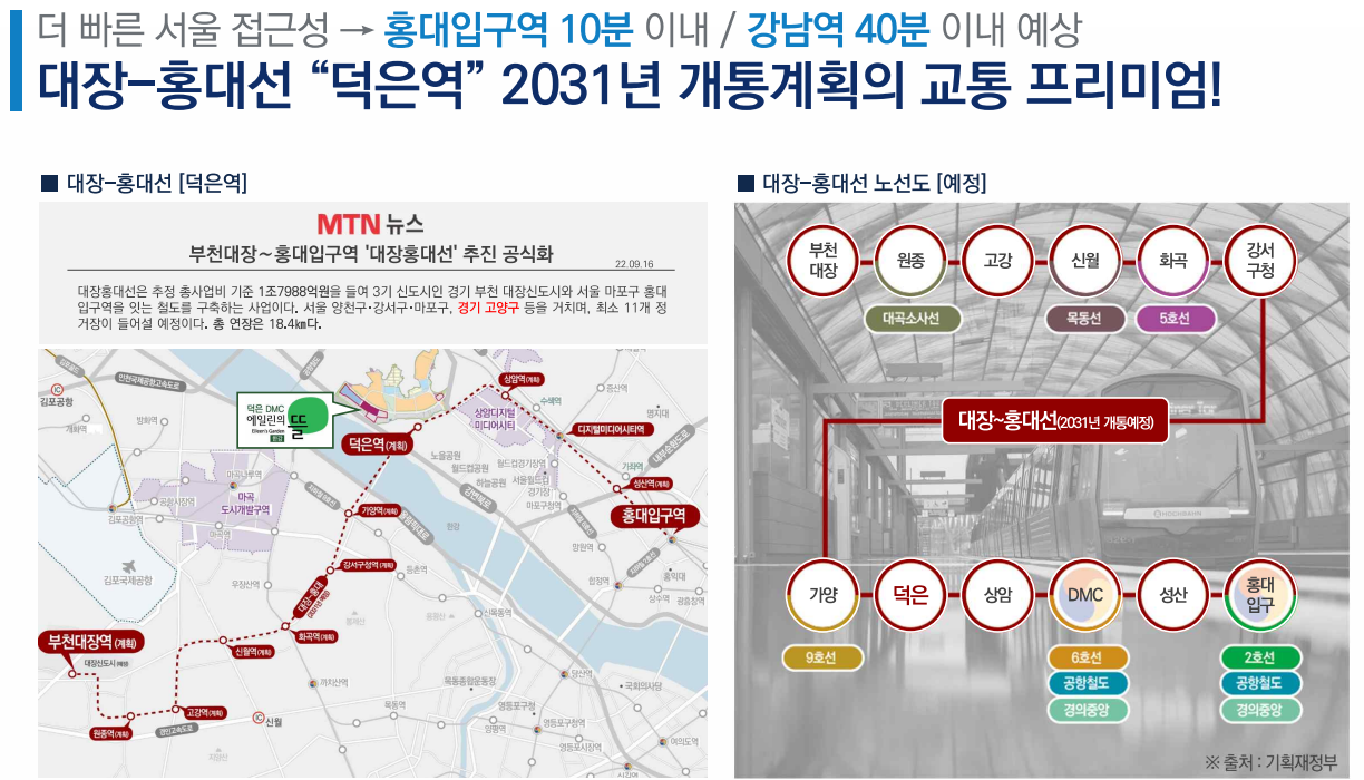 단지 인근에는 난지한강공원, 자유로, 올림픽대로, 강서 마곡지구, 상암 DMC 등이 위치해 있어 교통과 생활 편의성이 뛰어납니다. 특히, 덕은지구는 대장 ~ 홍대선 개발이 예정되어 있으며, 2025년 착공, 2031년 개통이 예상됩니다. 이로 인해 홍대입구역까지의 이동이 약 10분, 강남역까지는 약 40분으로 더욱 편리해질 것입니다.