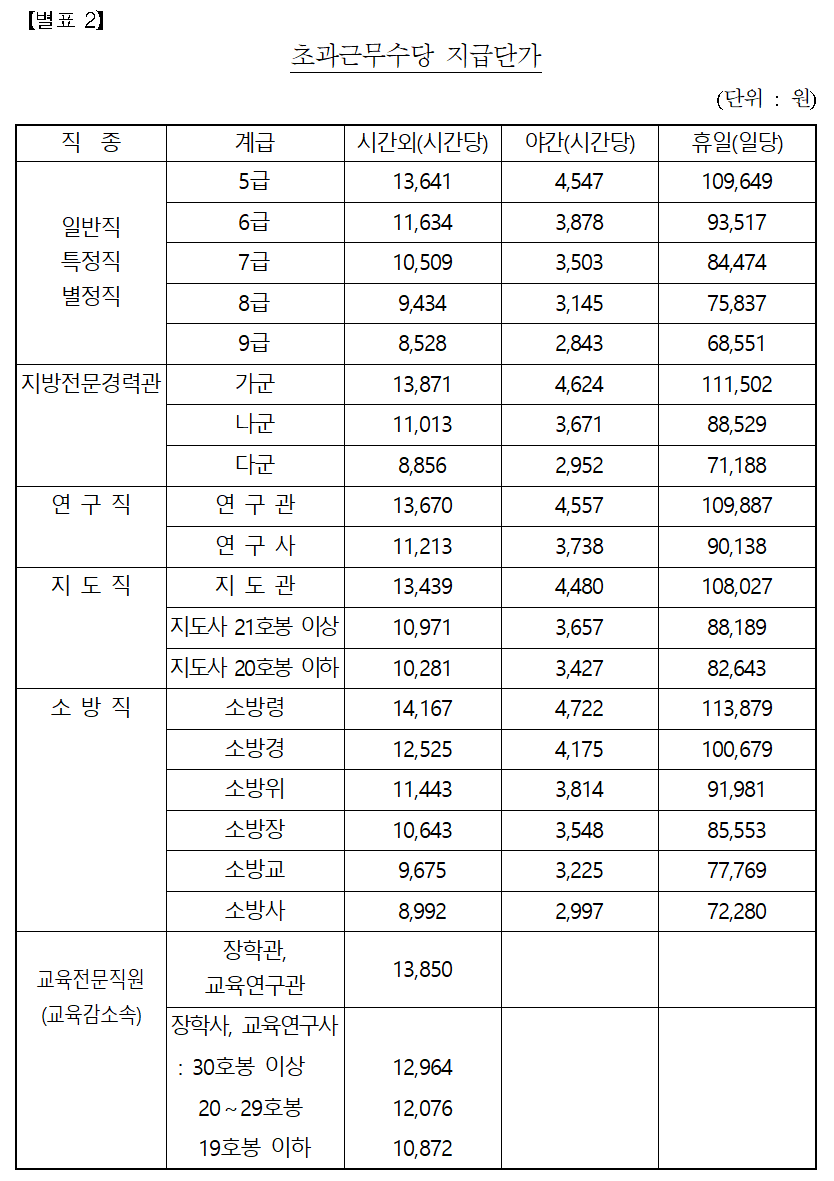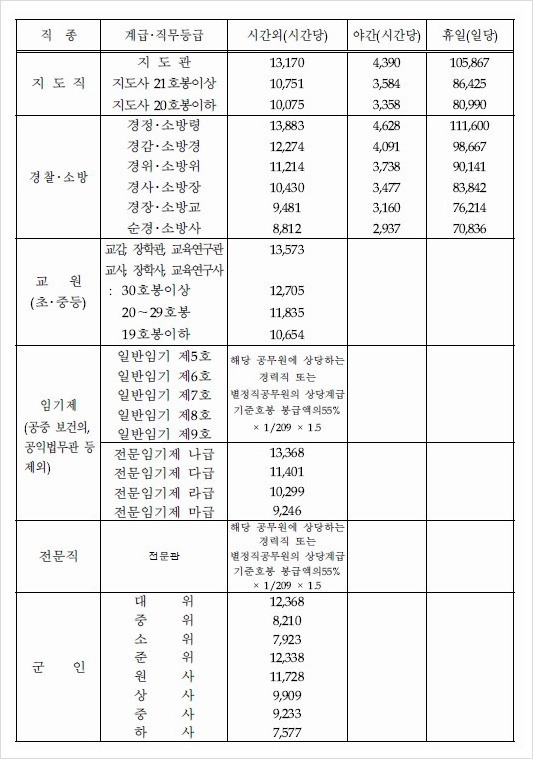 오늘 포스팅할 내용은 공무원수당 중 초과근무수당 지급단가표 입니다.