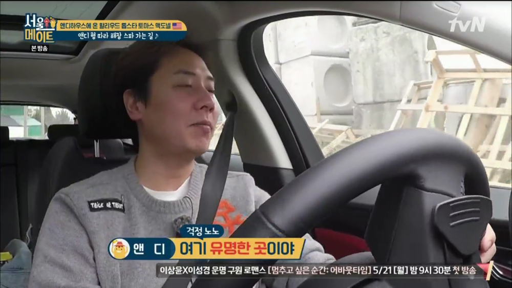 지난주에 강남의 자연산 횟집에서 돌멍게 주를 맛보고 숙취에 시달리는 토마스와 알렉스에게 숙취해소 음료 여명 808을 준 앤디.