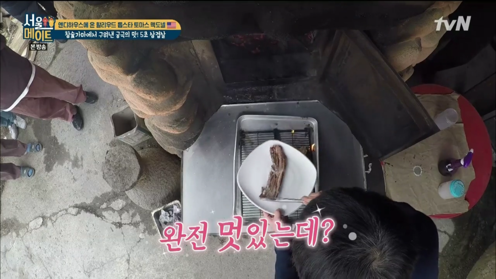 서울메이트 앤디 숯가마에서 즐길 꺼리는 고온의 숯에 삽으로 삼겹살을 굽는 3초 삼겹살.