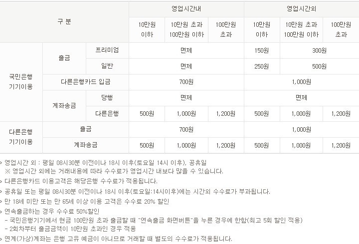 - 수수료 주의: 국민은행 ATM에서의 현금 인출은 대부분 추가 수수료가 부과되지 않지만, 타 은행 ATM나 외국 ATM에서 인출할 때에는 수수료에 주의하세요.