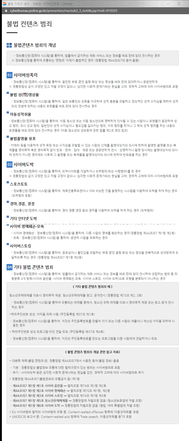 정보통신망 침해 범죄는 피해자의 계정 도용, 피해자 컴퓨터나 서버 등의 단순 침입, 중요한 자료 유출, 자료 훼손 등으로 구분됩니다. 해킹, 서비스 거부 공격(DDoS 등), 악성 프로그램 유포 행위 등이 바로 이 범주에 속합니다. 마지막으로 불법 콘텐츠 범죄는 법으로 금지된 콘텐츠의 유통과 관련된 범죄로, 일반 음란물을 포함한 아동 음란물, N 번 방 사건 같은 다크웹사이트 운영 및 불법 웹하드 업로더 등이 이에 해당됩니다. 이 외에도 인터넷 웹사이트를 통한 불법 스포츠 토토, 경마, 경륜, 경정, 카지노 등의 불법 도박 사이트 운영도 불법 콘텐츠 범죄에 포함됩니다.