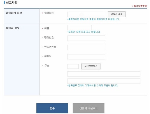 그러고 나서 개인정보동의와 본인인증을 마치면, 신고인인 본인의 주소와 전화번호 등의 간단한 인적사항을 기재합니다.