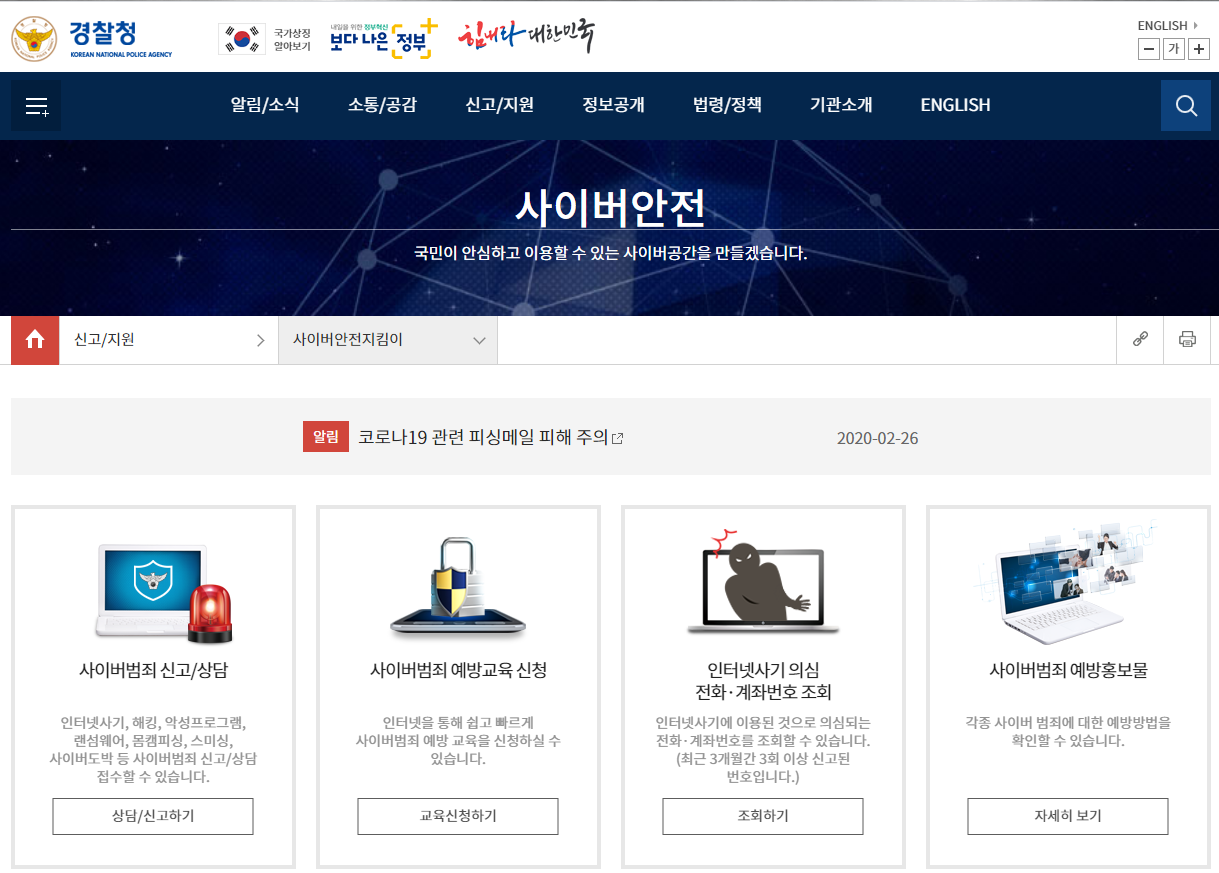 키워드: 사이버 범죄, 사이버수사대, 신고 방법, 정보통신망, 해킹, 불법 콘텐츠, 명예훼손, 스미싱, 피싱, 안전한 사이버 환경