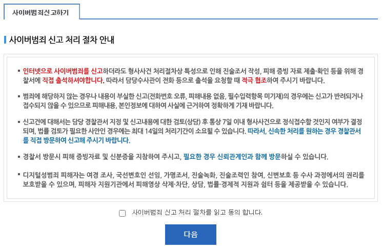 다시 사이버범죄 신고처리 절차 안내에 동의합니다.