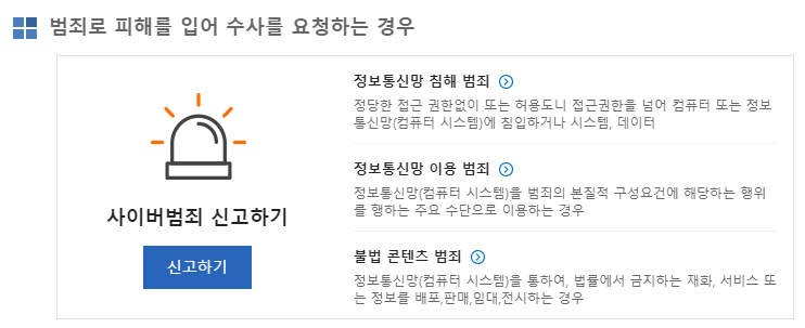 사이버안전국 홈페이지에서 신고/지원 메뉴에 들어가서 신고/상담에서 신고하기를 선택할 때 위의 큰 3가지 분류 중의 하나로 신고를 할 수 있습니다.