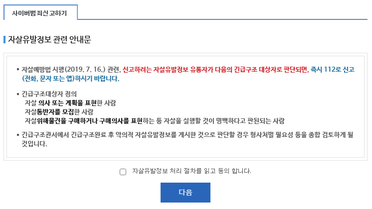 신고하기 버튼을 누르면 자살유발정보 처리절차 관련 안내문 동의를 합니다.