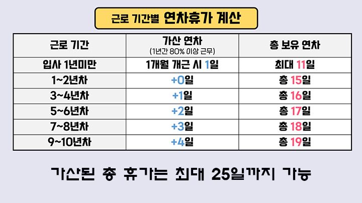 - 1년 동안 80% 이상 출근한 경우: 기본적으로 1년 동안의 근로에 대해 15일의 유급 휴가를 부여합니다.