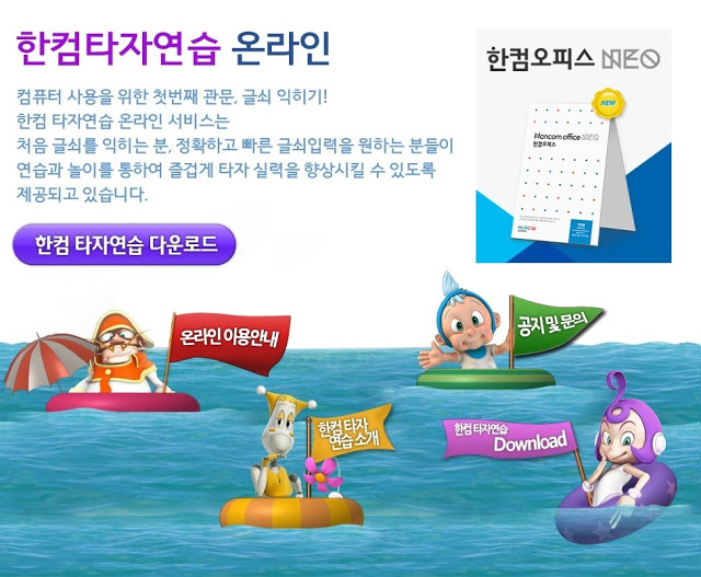 한글과 컴퓨터 사이트에 들어가서 아래로 내리면 한컴타자라고 조그마한 메뉴가 보입니다.