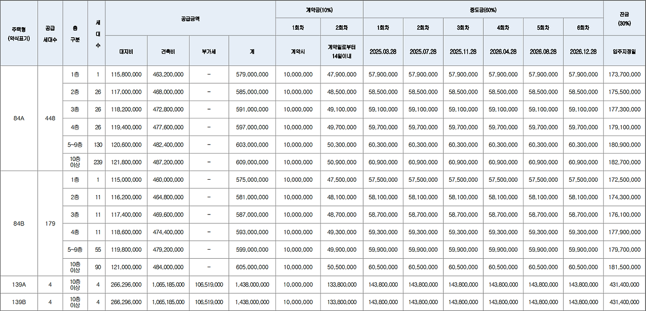- 84B 타입: 5억 7,500만원 ~ 6억 500만원
