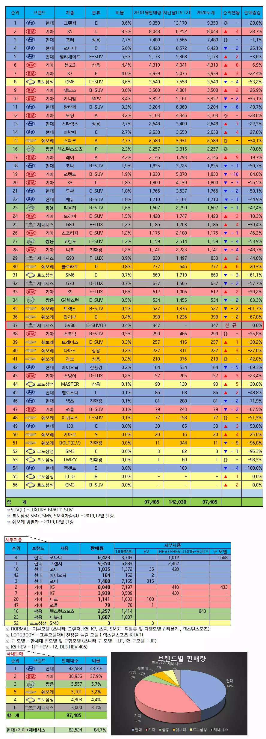 1월 자동차 판매량 순위 1위부터 7위까지가 모두 현대 기아 차량.